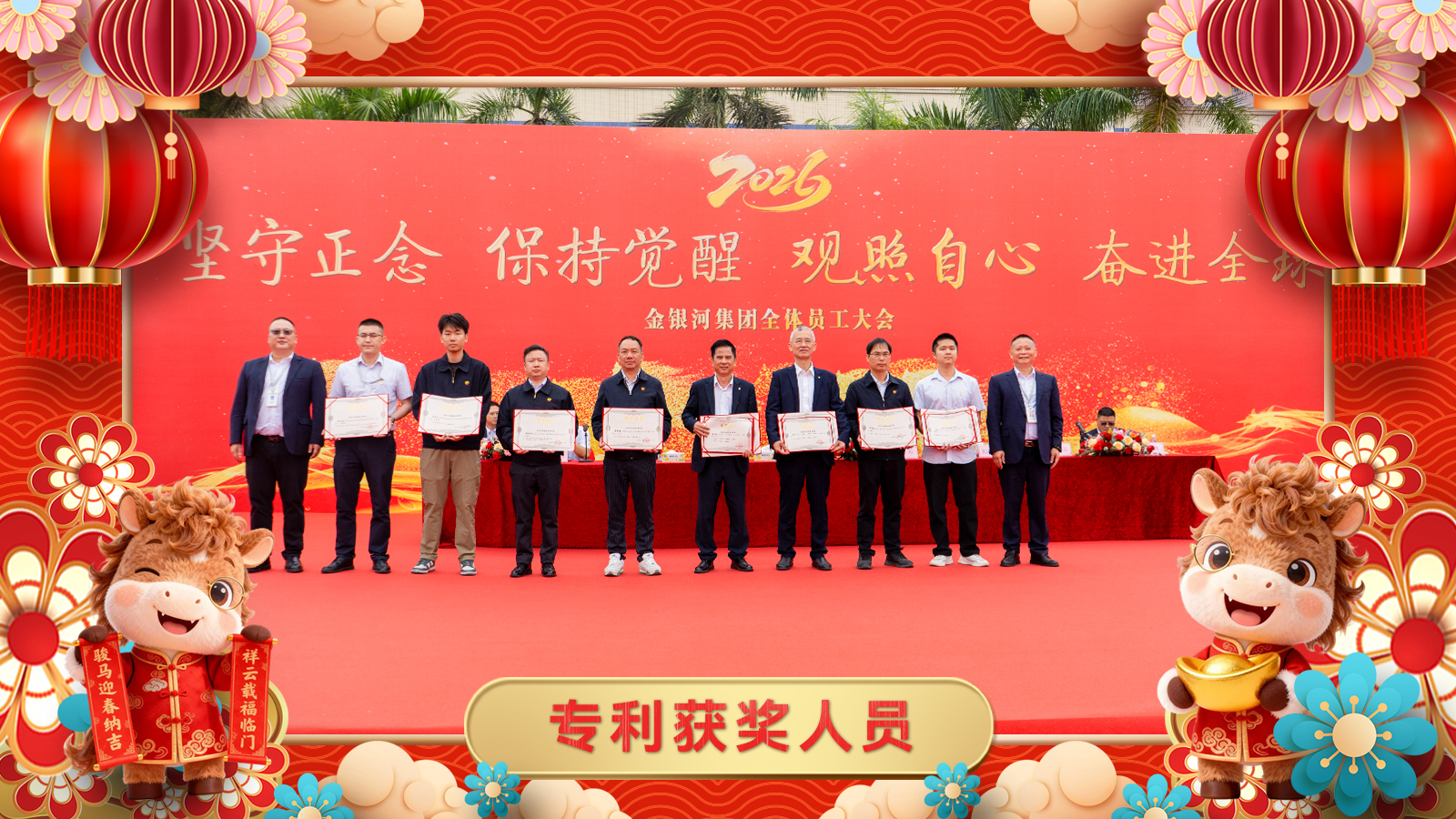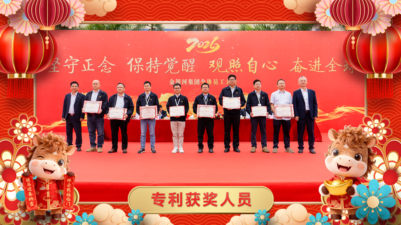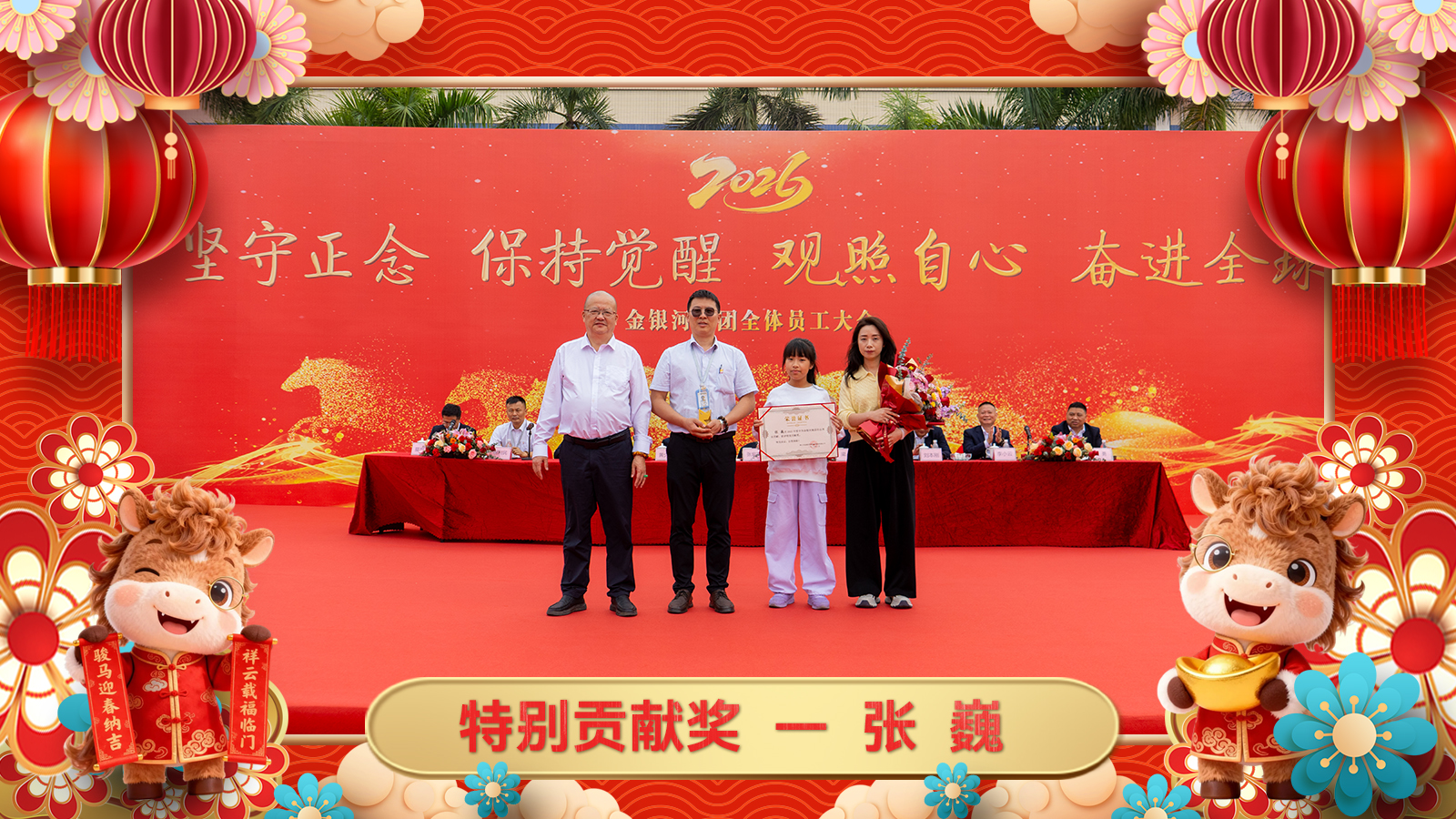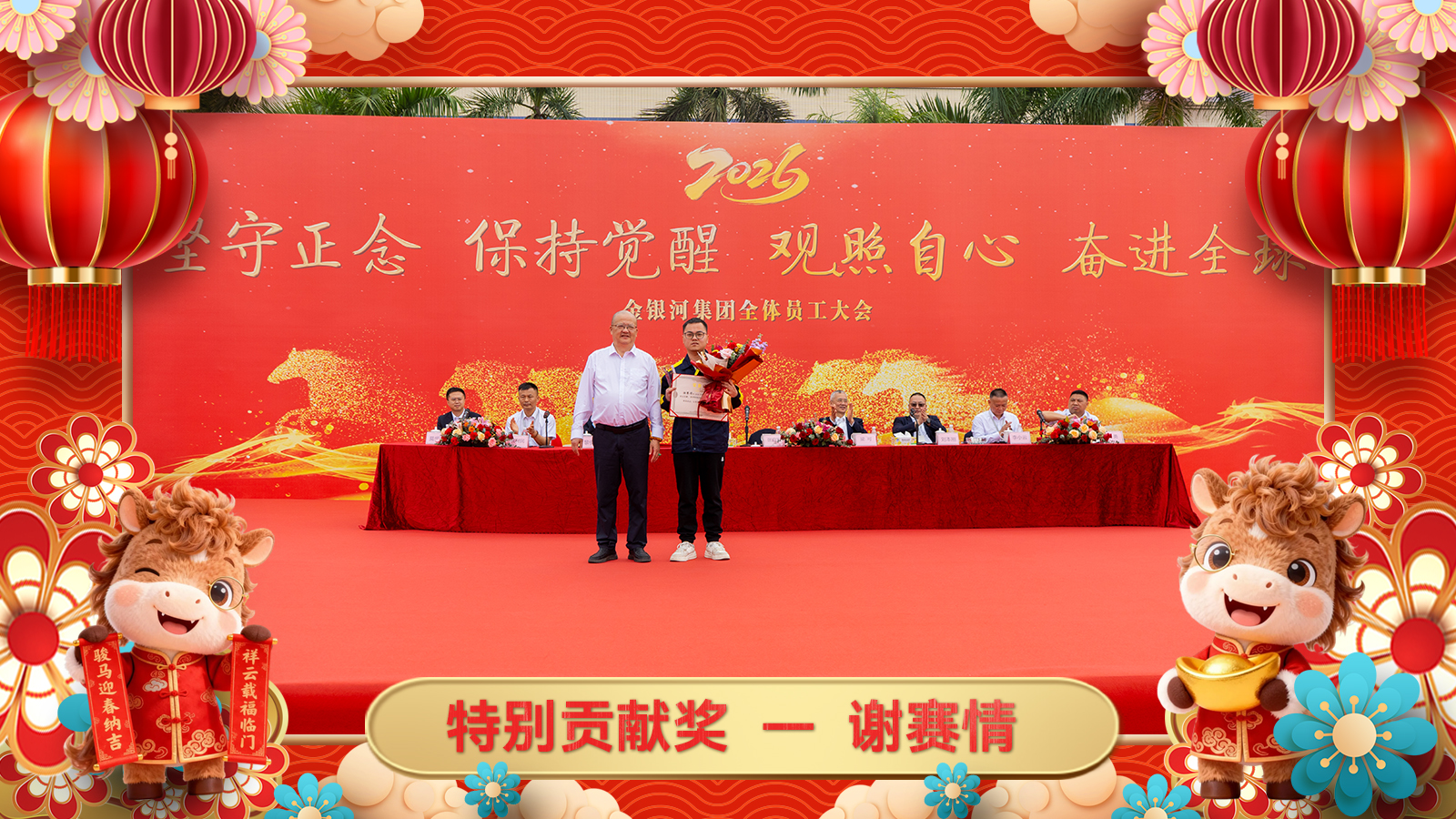 为表彰在2025年对集团发展作出特别贡献的个人和集体,以其事迹来带动、激励全体金银河人奋进向前、勇攀高峰,由张启发董事长亲自为金银河生产总监张巍、金德锂研发部部长谢赛情、金银河工程售后部印尼瑞浦项目组颁发2025年度特别贡献奖。