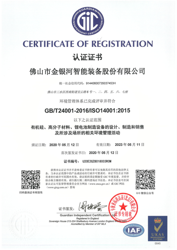 2020年5月,金银河“环境管理体系”完成评审并符合GB/T24001-2016/ISO 14001:2015,认证范围包括有机硅、高分子材料、锂电池制造设备的设计、制造和销售及所涉及场所的相关职业健康安全管理活动。