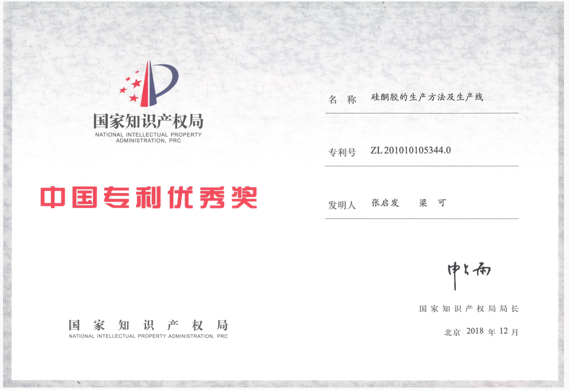 2018年12月,国家知识产权局对金银河发明专利“硅酮胶的生产方法及生产线”(专利号:ZL 201010105344.0)授予“中国专利优秀奖”。